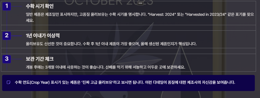 올리브유도 신선한 것이 중요하기 때문입니다.✅ 신선도를 확인하는 방법