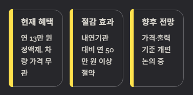 - 출력(kW) 기준: 내연기관의 배기량 대신 전기모터의 출력을 기준으로 세금을 매기는 방안이 유력하게 거론됩니다.