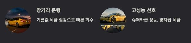 - 장거리 운행이 많은 분: 기름값은 물론 세금 절감분으로 차량 구매비를 빠르게 회수할 수 있습니다.