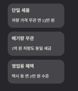 - 비유: 일반 식당이 메뉴마다 가격이 다른 '단품 메뉴'라면, 현재 전기차 자동차세는 누구나 동일한 가격으로 즐기는 '무한 리필 뷔페'와 같습니다.