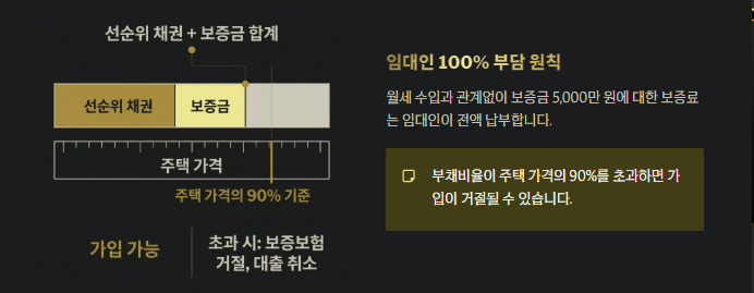 역전세 반환대출을 위해 가입하는 보증보험료는 임대인이 100% 부담하는 것이 원칙입니다. 월세 110만 원을 받고 계시더라도 보증금 5,000만 원에 대한 보증료는 별도로 책정됩니다. 만약 보증보험 가입이 거절되면 역전세 대출 자체가 회수되거나 실행되지 않을 수 있으니, 주택의 부채비율(선순위 채권+보증금)이 주택 가격의 일정 수준(보통 90%)을 넘지 않는지 미리 계산해 봐야 합니다.
