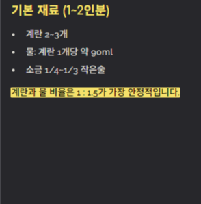 - 물: 계란 1개당 약 90ml