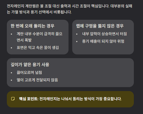 전자레인지 계란찜 실패의 원인은 대부분 시간 조절과 가열 방식에 있습니다.1. 전자레인지 계란찜이 자주 실패하는 이유