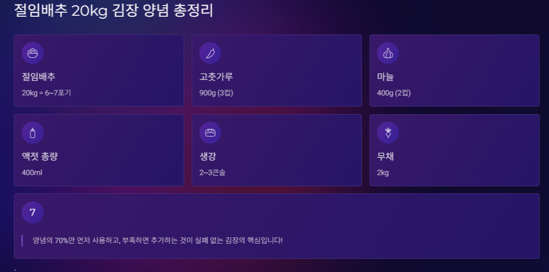 5. 절임배추 20kg 김장 양념 비율 요약