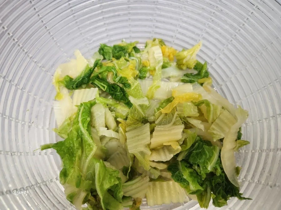 - 절임 배추를 물에 헹궈 짠기를 제거하고 물기를 꼭 짜줍니다.