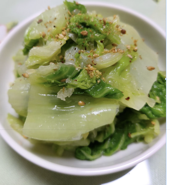 마지막으로 통깨를 뿌려주면 입맛 돋우는 배추 무침이 완성됩니다.