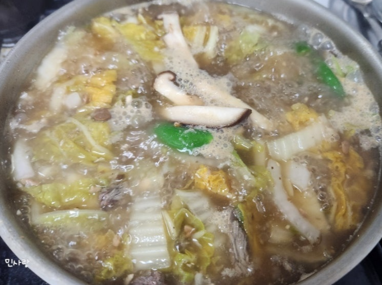 - 육수가 끓으면 손질한 절임 배추를 넣고 끓여줍니다.