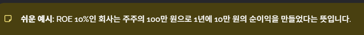 - 체크 사항: ROE가 높더라도 부채비율이 너무 높다면 (일반적으로 200% 이상) 재무적으로 위험할 수 있습니다. 높은 ROE가 건전한 자본과 순이익에서 나왔는지 반드시 확인해야 합니다.