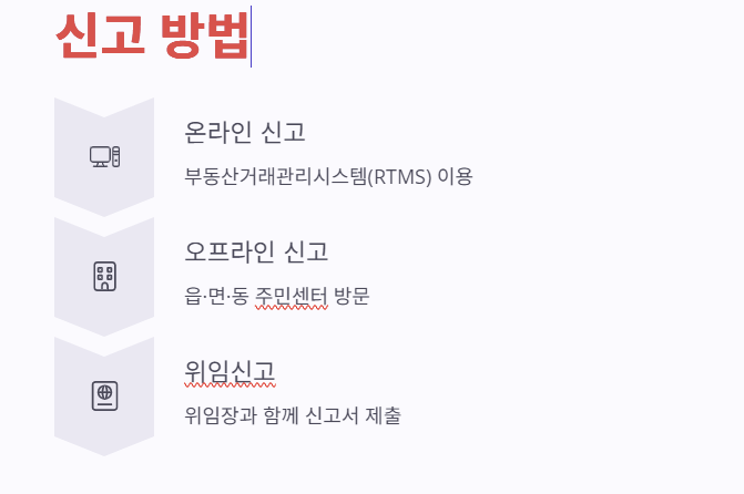 - 신고 기한: 계약 체결일 또는 가계약금 입금일로부터 30일 내 입니다