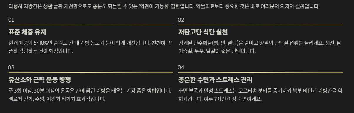 - 표준 체중 유지: 현재 체중의 5~10%만 줄여도 간 내 지방 농도가 눈에 띄게 개선됩니다.
