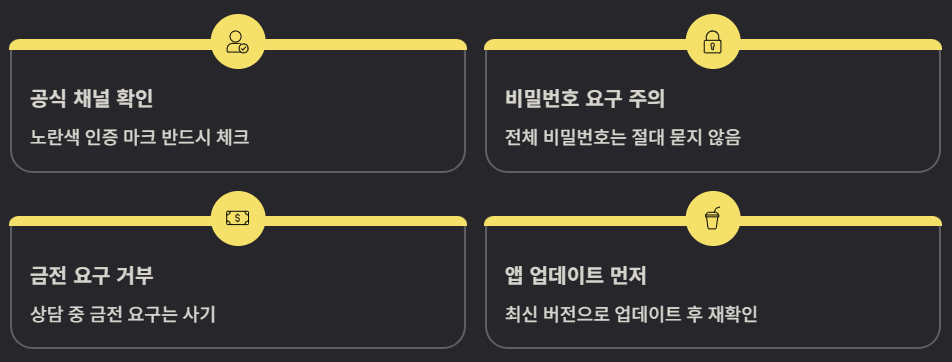 또한, 공식 채널이 아닌 사칭 채널에 주의해야 합니다. 카카오톡 내에서 '카카오 고객센터' 옆에 노란색 인증 마크가 있는지 반드시 확인하세요. 상담 과정에서 비밀번호 전체를 묻거나 금전을 요구하는 경우는 절대 없으니 이 점은 꼭 유의하셔야 합니다.
