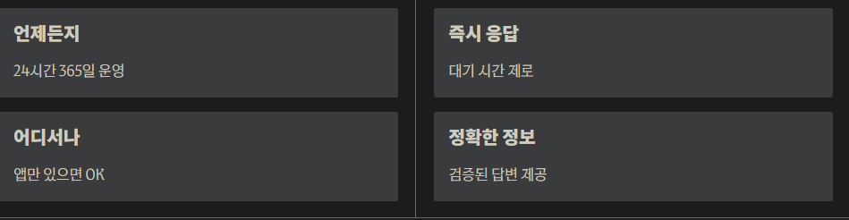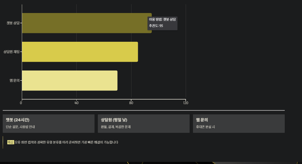 구분 이용 방법 및 특징 추천 상황 챗봇 상담 24시간 운영, 카카오 채널 내 메뉴 이용 단순 질문, 사용법 안내 필요 시 상담원 채팅 평일 10:00~18:00, 실시간 대화 가능 환불, 결제 오류, 복잡한 계정 문제 웹 문의 공식 홈페이지 '문의하기' 이용 휴대폰 분실, 앱 실행 불가능 시 주의 사항 공식 인증 마크 확인, 사칭 채널 주의 보안 사고 예방 및 본인 확인