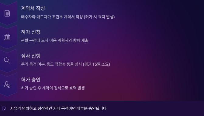 단순 신고가 아니라, 말 그대로 허가입니다. 허가 없이 계약을 진행하거나 소유권 이전을 하면 계약 자체가 무효가 됩니다.쉽게 말해, “이 땅을 왜 사려고 하는지, 사서 무엇을 하려는지”를 정부가 확인하고 허락하는 절차라고 이해하면 됩니다.