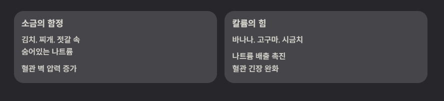 우리가 흔히 먹는 김치, 찌개, 젓갈에는 생각보다 엄청난 양의 소금이 들어있어요. 소금 속 나트륨은 혈관 속으로 수분을 끌어들여서 혈관 벽에 가해지는 압력을 높이는 주범이죠. 그래서 식단 관리는 가장 기본이 되는 혈압 낮추는 방법이라고 할 수 있습니다.