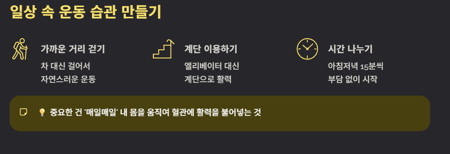 가까운 거리는 차 대신 걷고, 엘리베이터보다는 계단을 이용하는 사소한 변화부터 시작해 보세요. 만약 30분을 한 번에 내기 어렵다면 아침저녁으로 15분씩 나누어 걸어도 괜찮아요. 중요한 건 '매일매일' 내 몸을 움직여서 혈관에 활력을 불어넣어 주는 거예요.