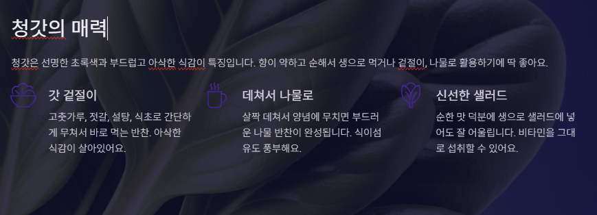 ✅ 영양: 식이섬유와 비타민이 풍부해 소화를 돕고 잎채소 특유의 영양을 제공합니다.
