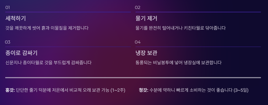✅ 보관 팁: 수분에 약하니 종이타월로 감싸 비닐봉지에 넣어 냉장 보관하고, 빠르게 소비하는 것이 좋아요.