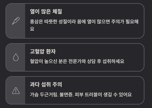아무리 좋은 홍삼 효능이라도 모든 사람에게 무조건 다 좋은 건 아닐 수 있어요. 홍삼은 기본적으로 따뜻한 성질을 가지고 있기 때문에 평소 몸에 열이 너무 많거나, 고혈압이 심한 분들은 섭취 시 조금 조심할 필요가 있습니다.