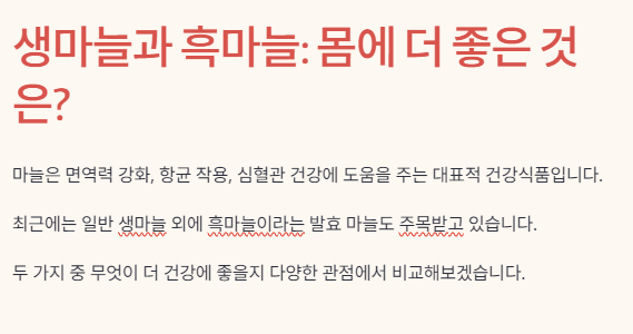 또한 노년층, 만성 질환자, 면역력 저하자에게는 흑마늘이 더 적합한 선택이 될 수 있어요. - 마늘은 전통적으로 면역력 강화, 항균 작용, 심혈관 건강에 도움을 주는 대표적인 건강식품입니다.