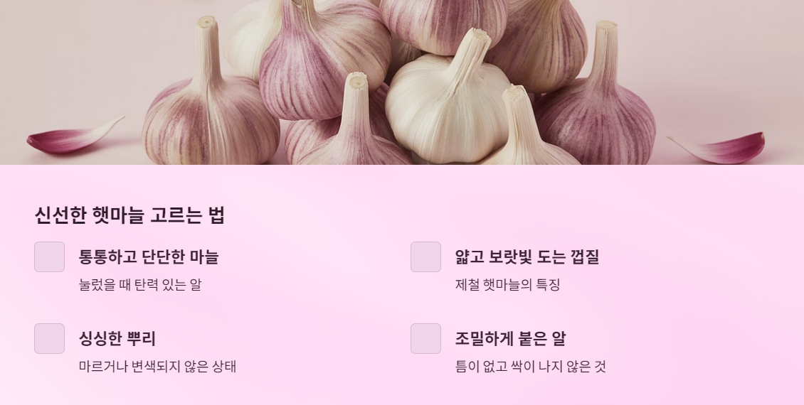 - 제철 마늘은 껍질이 얇고 약간 보랏빛이 도는 것이 특징입니다. 과도하게 하얗거나 거칠면 오래된 저장 마늘일 수 있습니다.