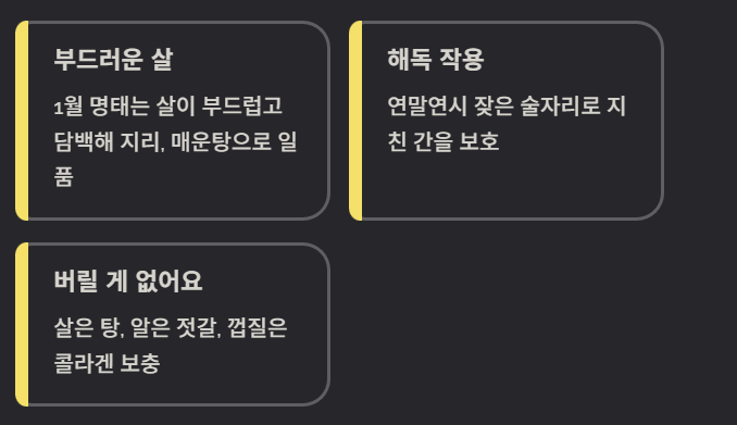 명태는 버릴 게 하나도 없는 생선이에요. 살은 국이나 찜으로, 알과 창난은 젓갈로, 껍질은 볶아서 먹으면 콜라겐까지 챙길 수 있거든요. 특히 생태로 끓인 탕은 살이 입안에서 사르르 녹는 그 부드러움이 겨울 추위를 단번에 잊게 해 줄 만큼 매력적입니다.