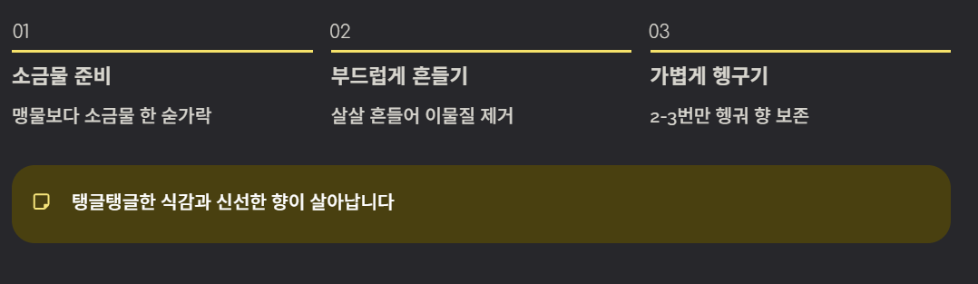 굴을 씻을 때는 맹물보다는 소금물을 활용하는 게 좋아요. 물에 소금을 한 숟가락 풀고 굴을 넣어 살살 흔들어 씻으면 이물질이 잘 빠지고 탱글탱글한 식감도 살아난답니다. 너무 오래 씻으면 굴 특유의 향이 날아갈 수 있으니, 두세 번 가볍게 헹구는 정도로만 해주시는 게 비결이에요.