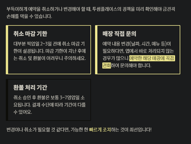 부득이하게 예약을 취소하거나 변경해야 할 때, 투썸플레이스의 정책을 미리 확인해야 금전적 손해를 막을 수 있습니다.