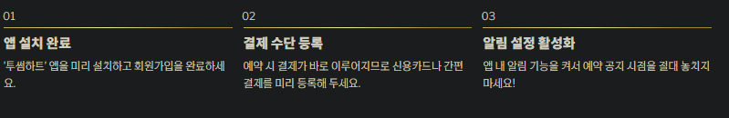 - 결제 수단 등록: 예약 시 결제가 바로 이루어지므로, 미리 사용할 신용카드나 간편 결제 수단을 앱에 등록해 두세요. 결제 정보 입력 시간을 줄여야 성공 확률이 높아집니다.