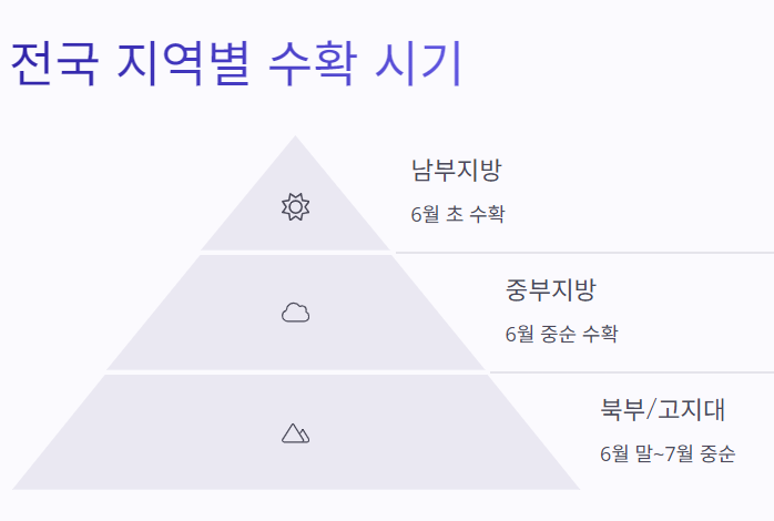 - 수확 시기: 전국적으로 5월 말 ~ 6월 중순