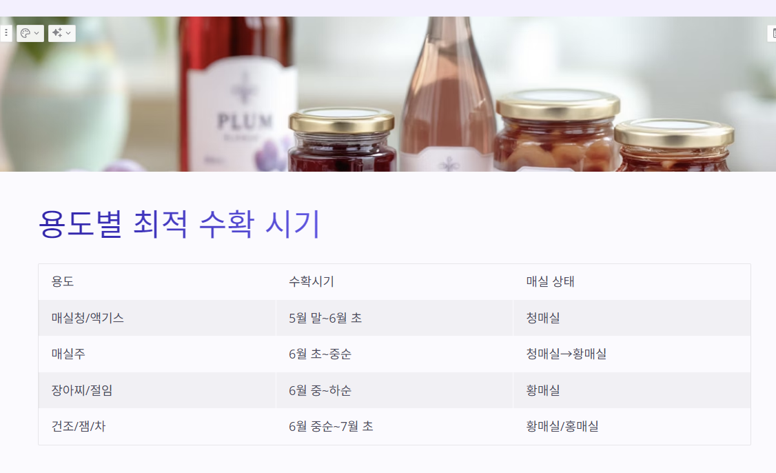 - 특징: 초록→노란색으로 변하며, 단맛과 향이 강해 매실잼·차·건매실·매실주에 적합합니다