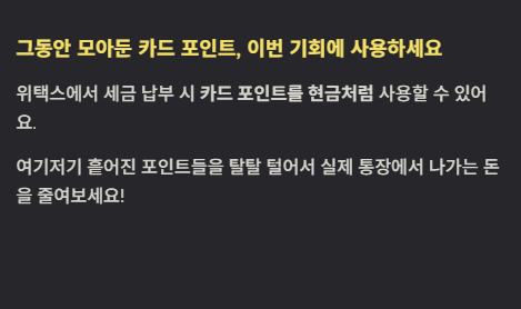 위택스에서 세금을 낼 때 그동안 모아둔 카드 포인트를 현금처럼 사용할 수도 있어요. 여기저기 흩어져서 잊고 있었던 포인트들을 이참에 탈탈 털어서 세금 내는 데 쓰면, 실제 내 통장에서 나가는 돈이 줄어들어 기분이 더 좋아지겠죠?