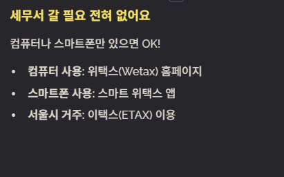 신청 기간이 되면 접속자가 몰려 사이트가 느려질 수도 있어요. 미리미리 스마트폰에 '스마트 위택스' 앱을 설치해 두고 간편 인증서 등을 등록해 놓으면, 당일에 당황하지 않고 5분 만에 납부를 끝낼 수 있답니다.
