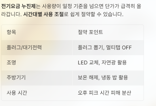 전기요금 누진제는 사용량이 일정 기준을 넘으면 단가가 급격히 올라갑니다. 시간대별 사용 조절로 쉽게 절약할 수 있어요.