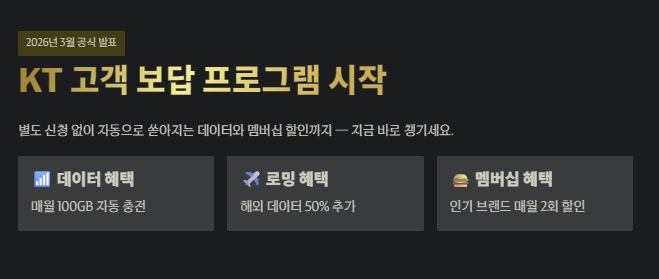 이런 고민을 해결하기 위해 KT가 2026년 3월 1일부터 파격적인 고객 보답 프로그램을 가동합니다. 별도의 복잡한 신청 없이도 자동으로 들어오는 데이터부터, 당장 오늘 저녁 메뉴를 결정지을 멤버십 할인까지! 지금부터 이 혜택들을 어떻게 하면 100% 내 것으로 만들 수 있는지 핵심만 콕 집어 설명해 드리겠습니다.